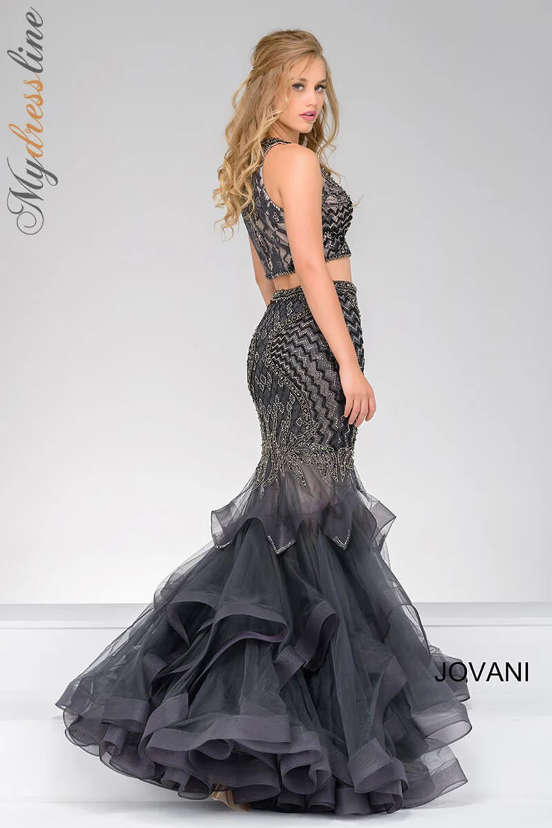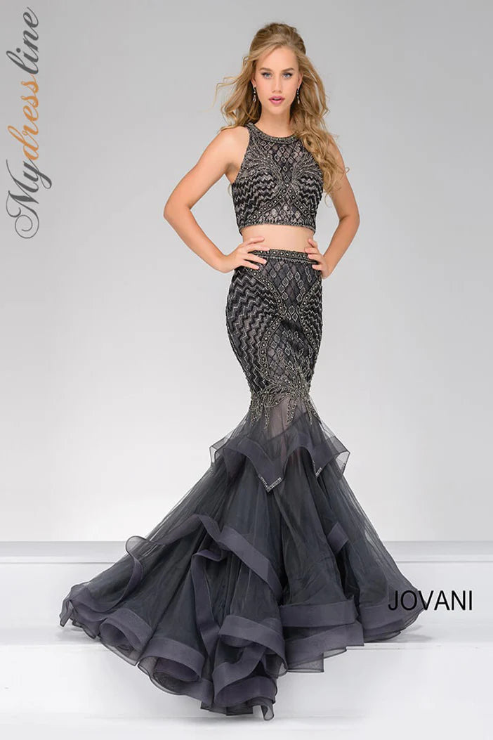 Look and feel like a princess in this stunning two-piece evening gown! This long dress features a beaded bodice with a crew neckline and a zipper back closure. The waistband accentuates the curves and area of the body and the skirt is tailored in a mermaid silhouette with exquisite tiers for a dramatic effect. Sophisticated and unique, this sleeveless dress will surely be a standout at any formal event.
