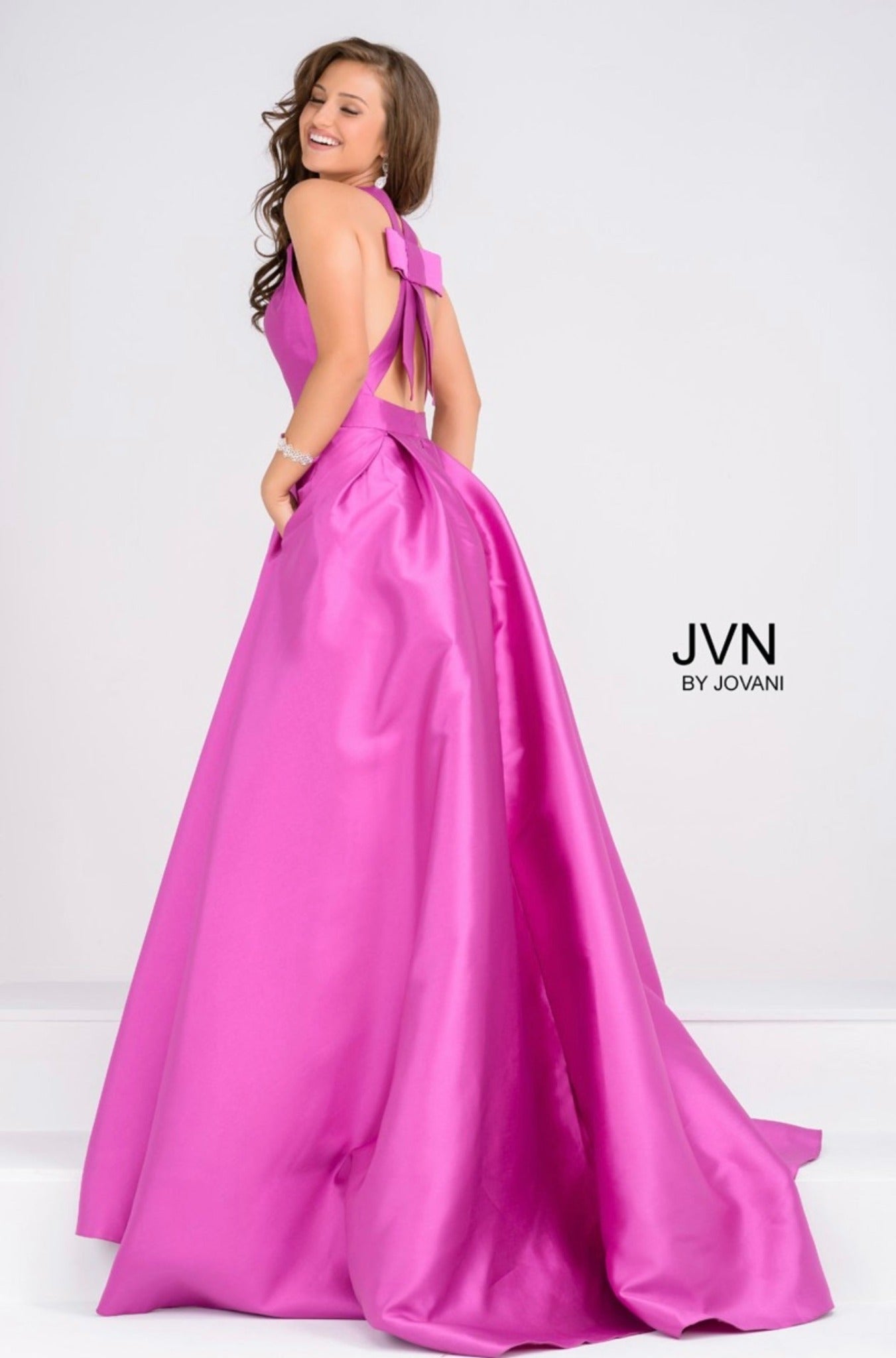Expertly crafted from luxurious Mikado fabric, the JOVANI V Neck Prom Ballgown is a stunning choice. The pleated skirt adds volume and movement, while the V neckline elongates the torso. Perfect for prom or any special occasion.