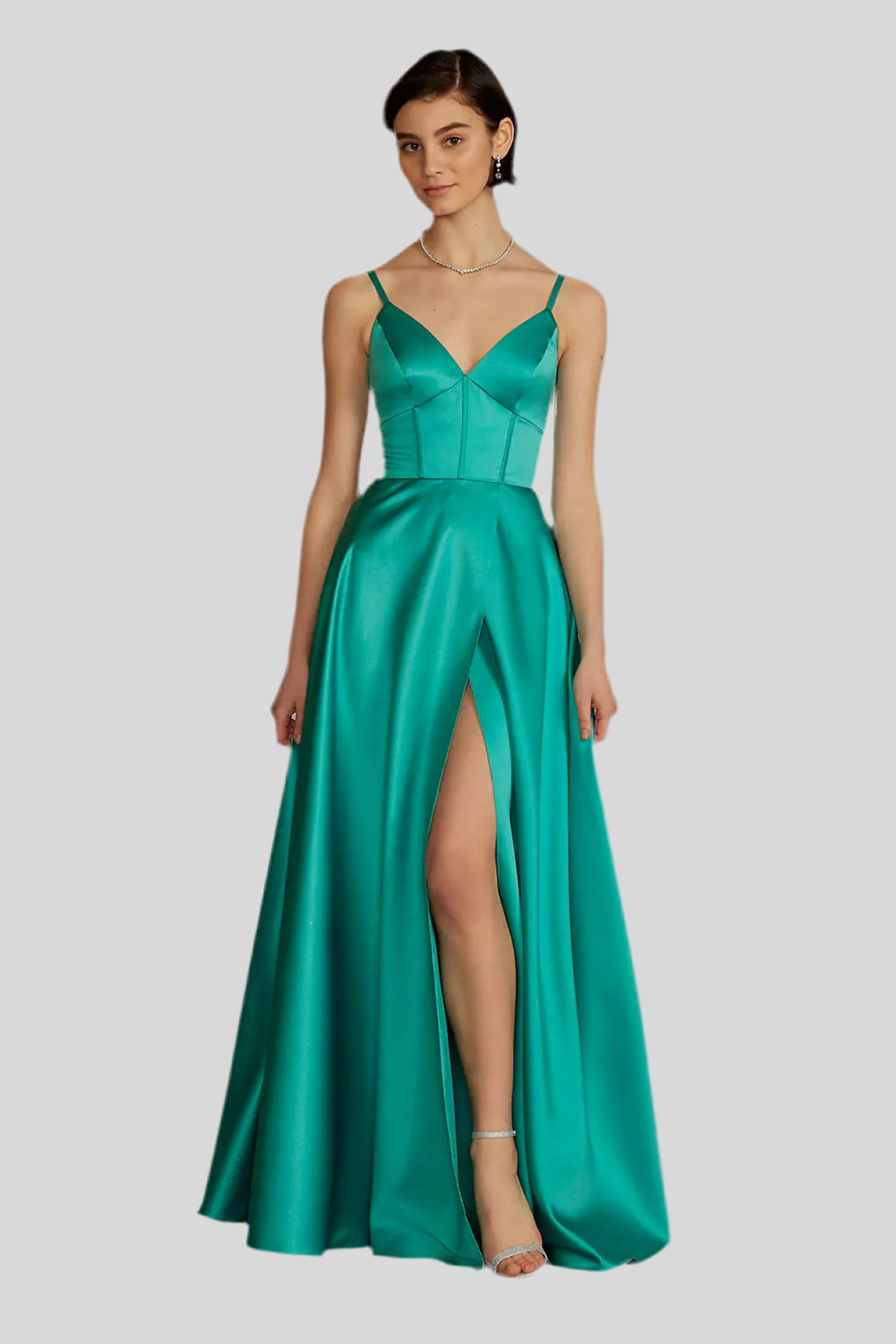 Made from sleek satin fabric, this A-line gown is made for your main character moment. A flowing full skirt contrasts beautifully with a fitted corset bodice, creating one show stopping, prom-ready look.