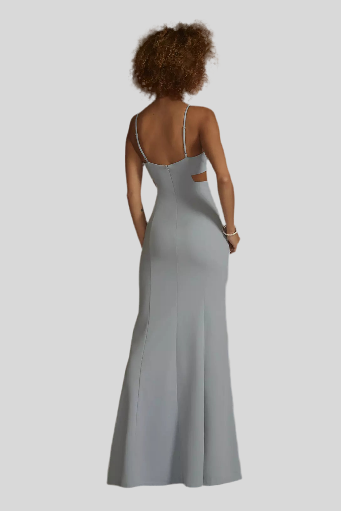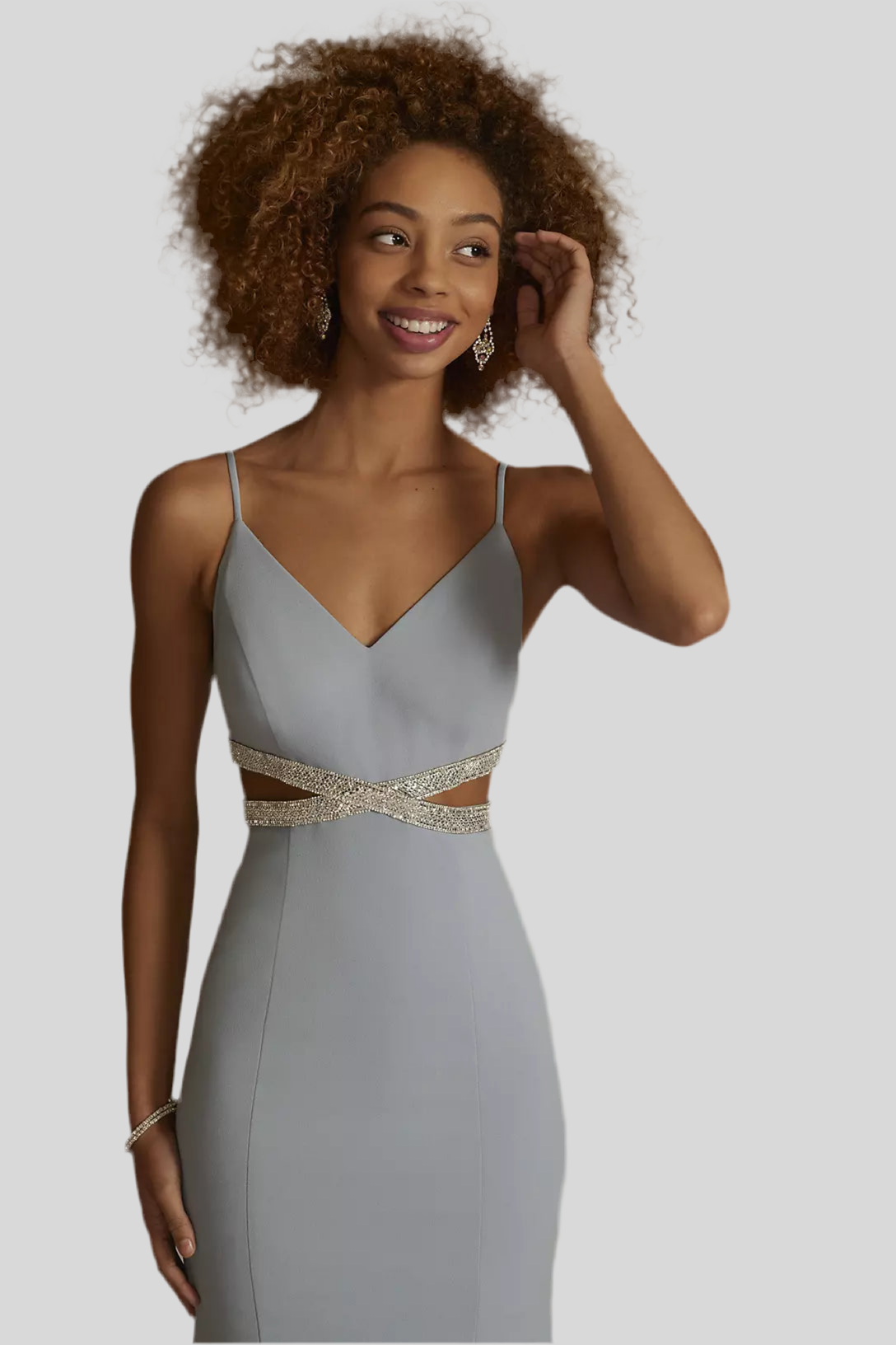 This stretch crepe sheath gown shines with a cool detail: a beaded X-cut waist for extra sparkle on the dance floor. Flawless for prom or any formal.