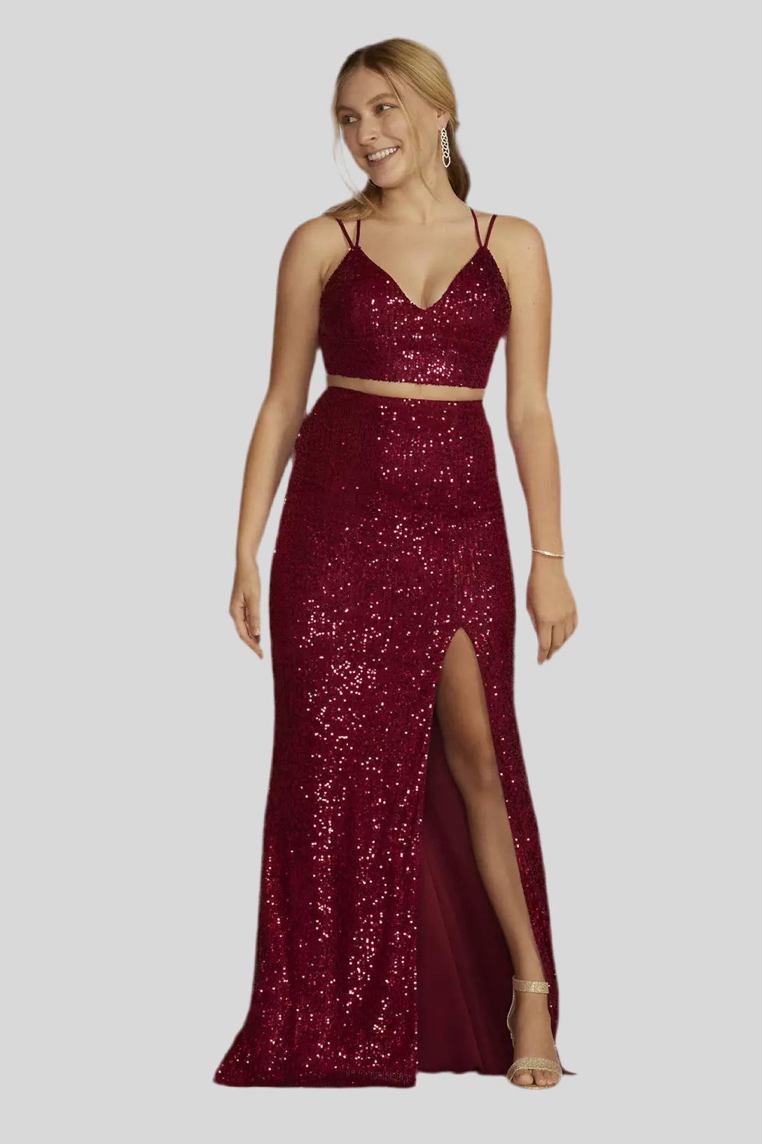 Party rule #1: You can never go wrong with sequins. Shine all night long in this two-piece set featuring a cropped tank and floor-length skirt with slit.