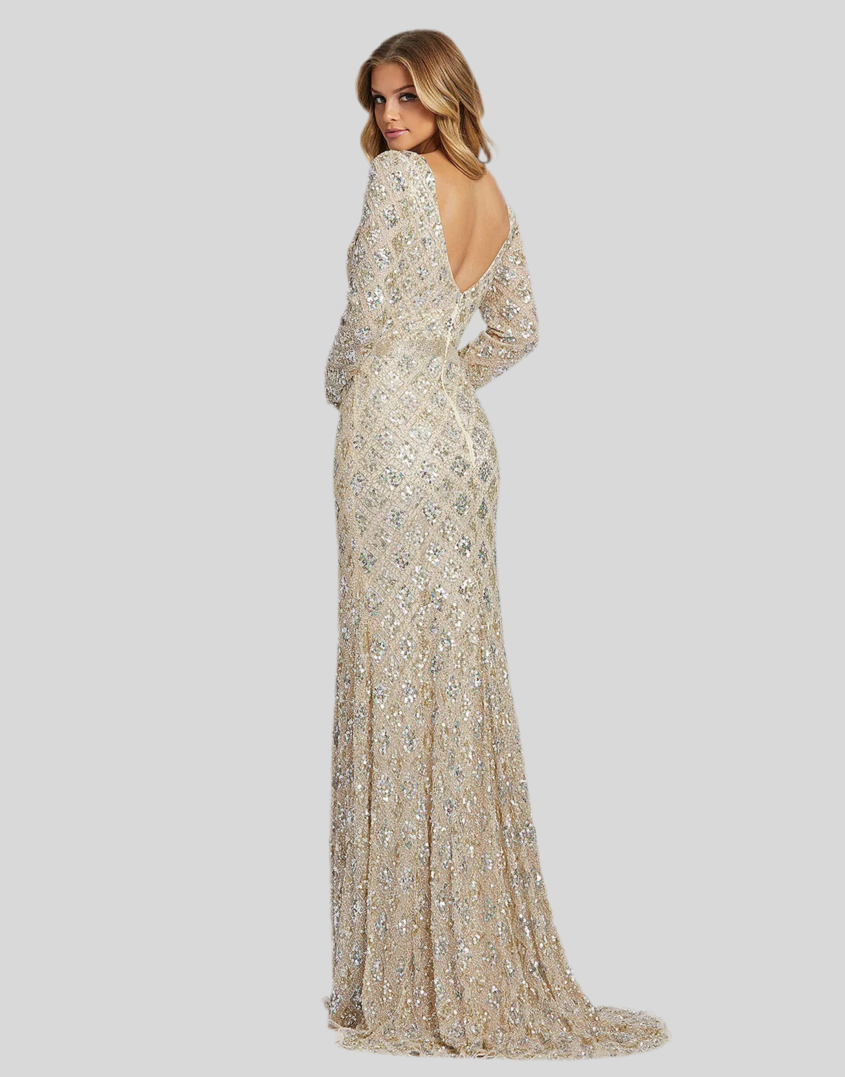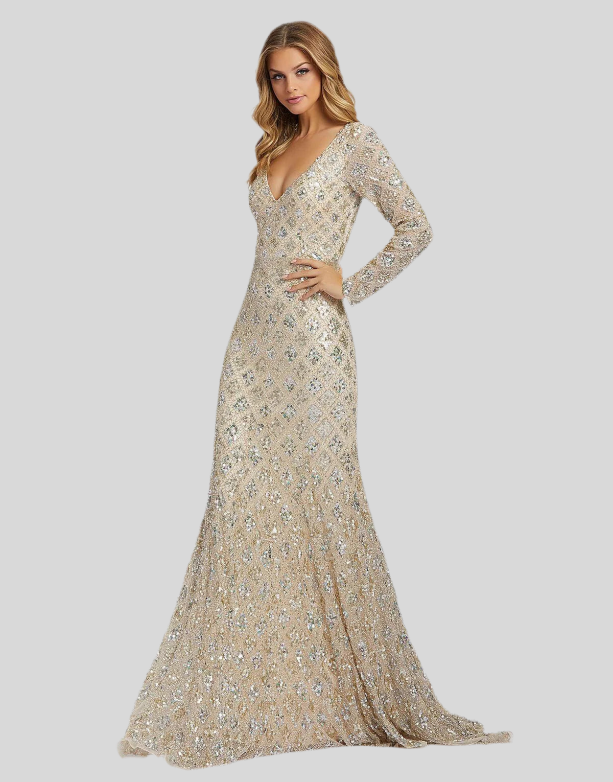Ombre evening gown with geometric embellishment throughout the mesh overlay. This elegant long-sleeve evening gown features a hand-beaded belt at the natural waist and a floor-length trumpet skirt.