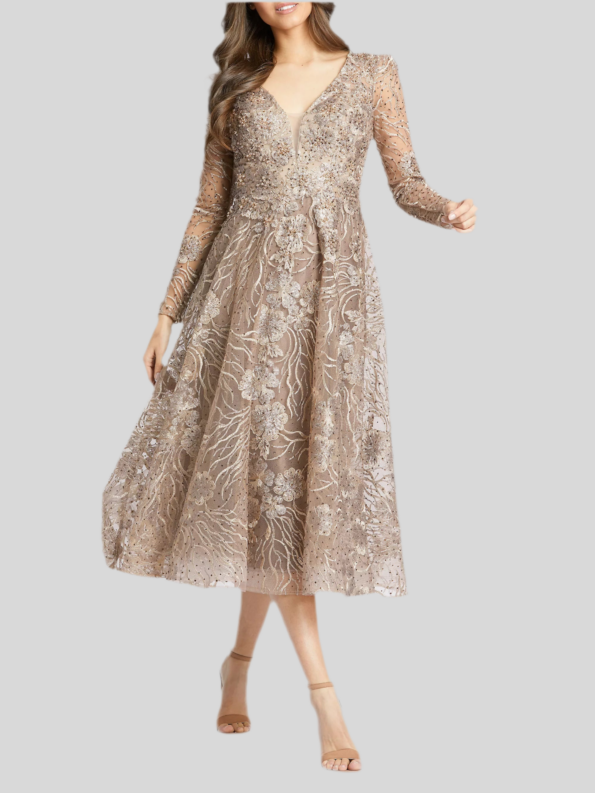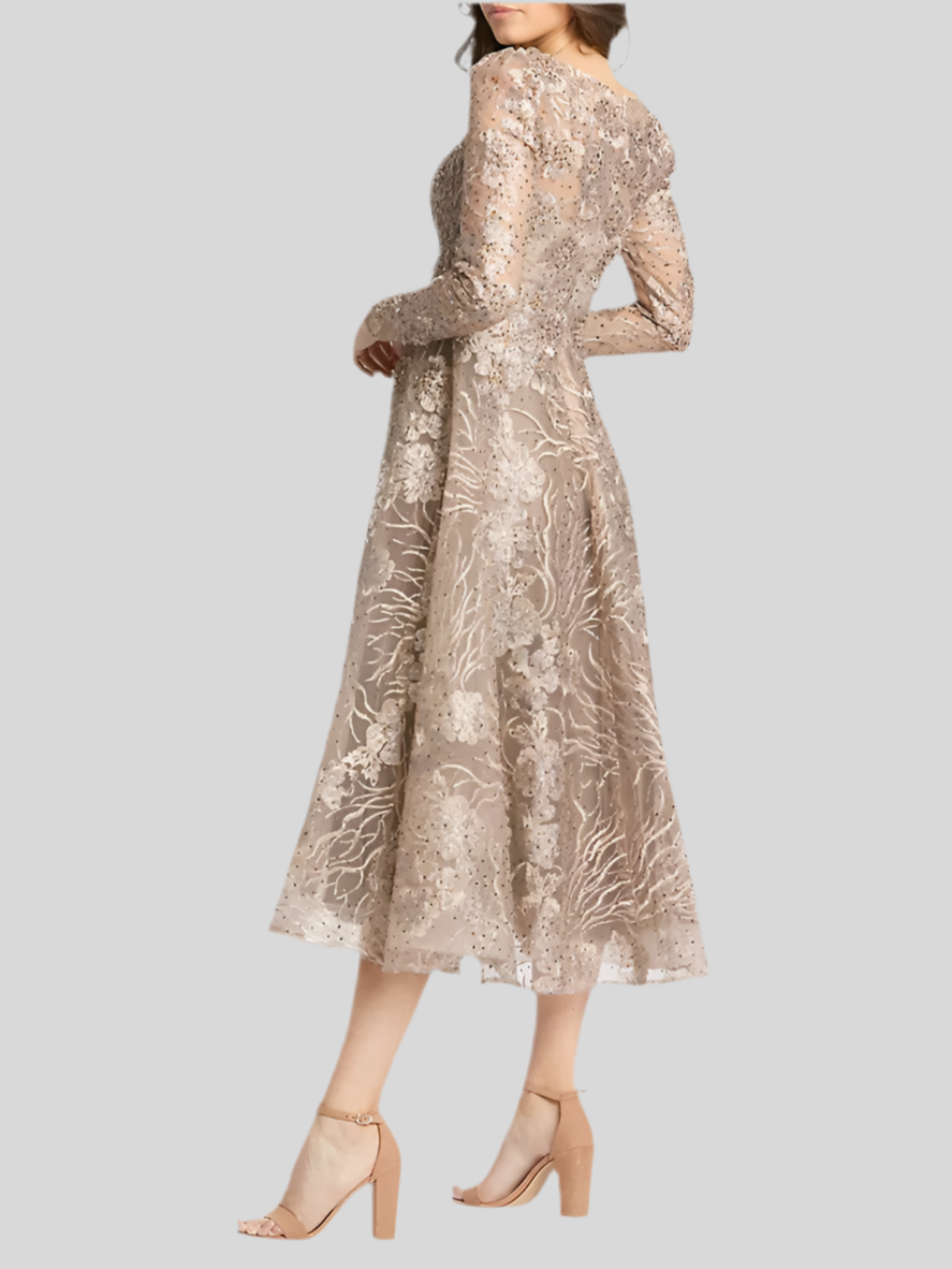 Cut in a fit-and-flare silhouette, this long-sleeve midi-dress boasts beaded and sequined floral patterning.