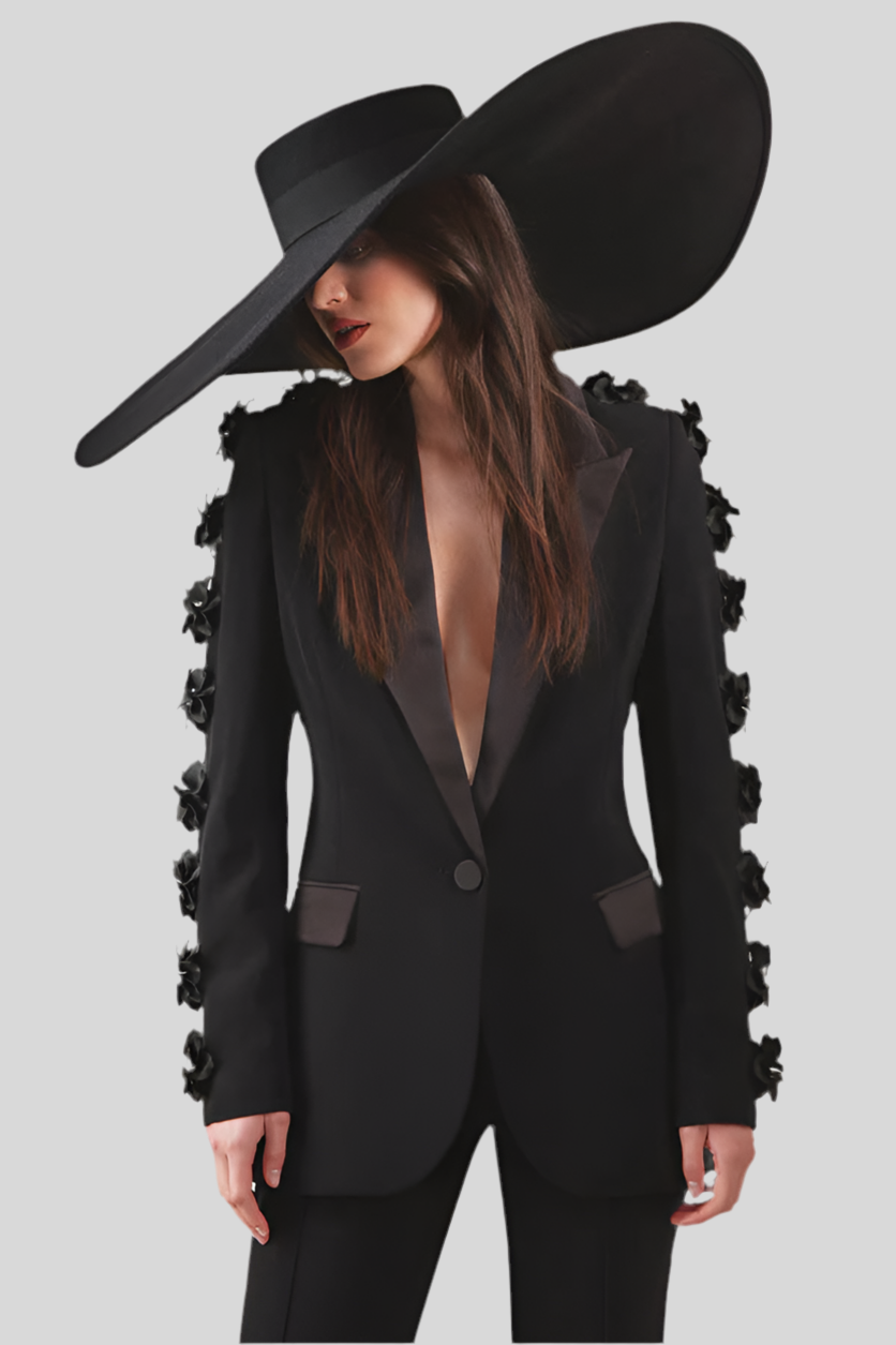 LEONIE is a structured, sculpting single-breasted tailored suit jacket crafted from exclusively designed crepe with a contrast satin collar and pockets. It is cut to a structured fit with shoulder pads, large floral appliqués down both sleeves with faux pearl detailing at the centre of each flower, functional flap satin detailed pockets, silhouette-enhancing seam detailing, and finished with a satin button closure.