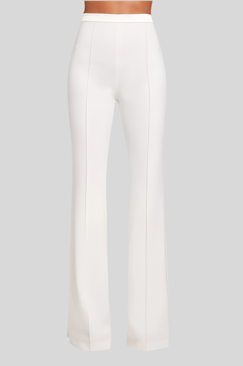 The CHARLOTTE White Pants are the perfect piece for those daring to make a statement. Made from our exclusive crepe and satin material, this simple statement pant is perfect for those having rehearsal dinners or even for the big day.