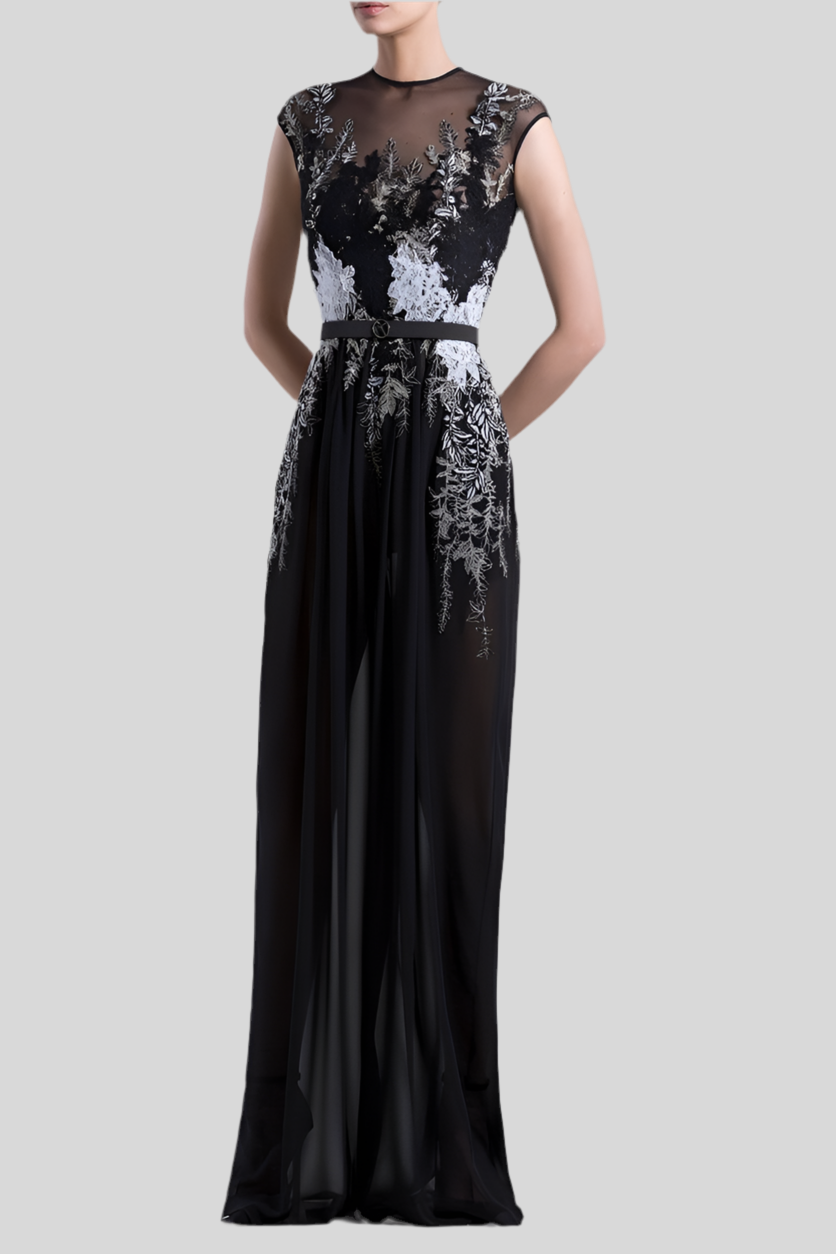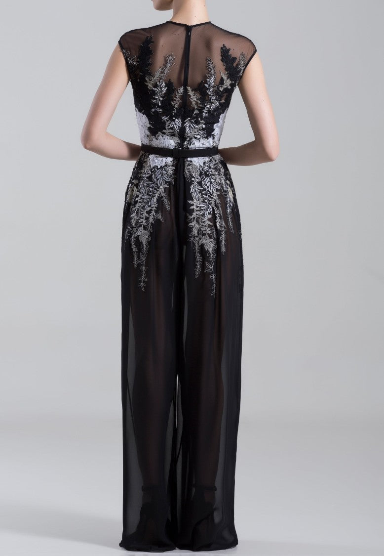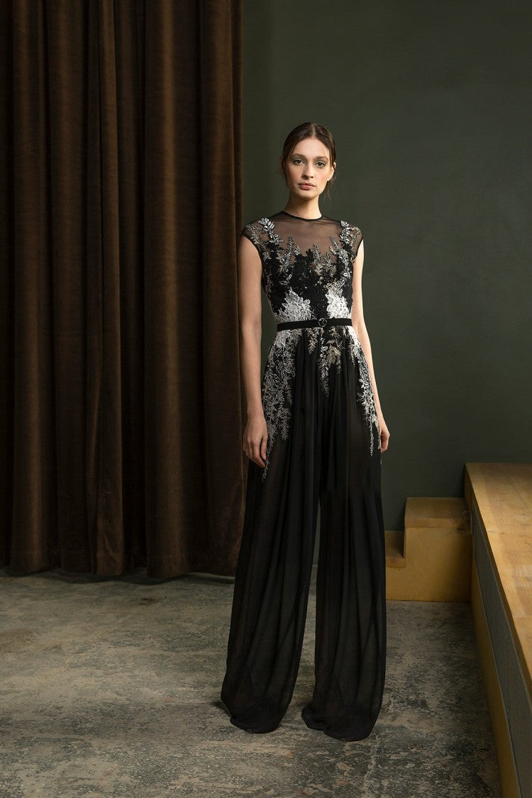 Expertly crafted by Saiid Kobeisy, this elegant jumpsuit boasts a sleeveless design and intricate embroidery. Made from high-quality crepe georgette, it also comes with a thin belt for a flattering and versatile fit. Elevate your wardrobe with this luxurious and versatile piece.