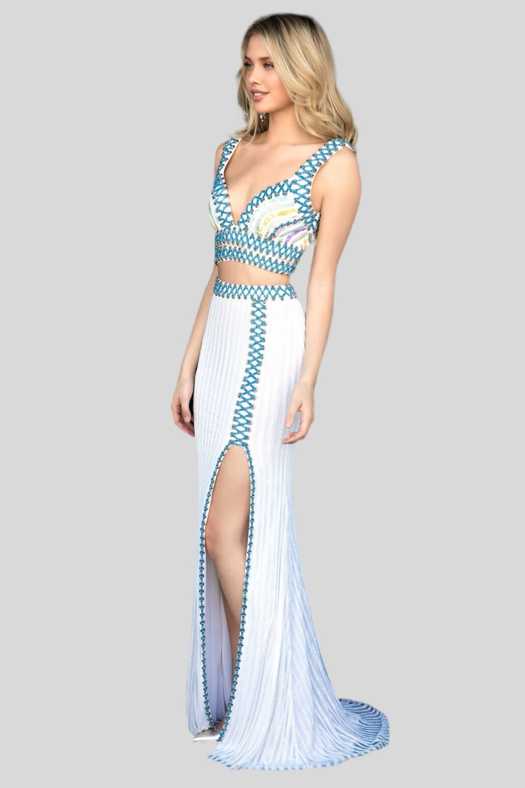 Fitted beaded two piece with V neck bodice, cross stitch detail and slit skirt.